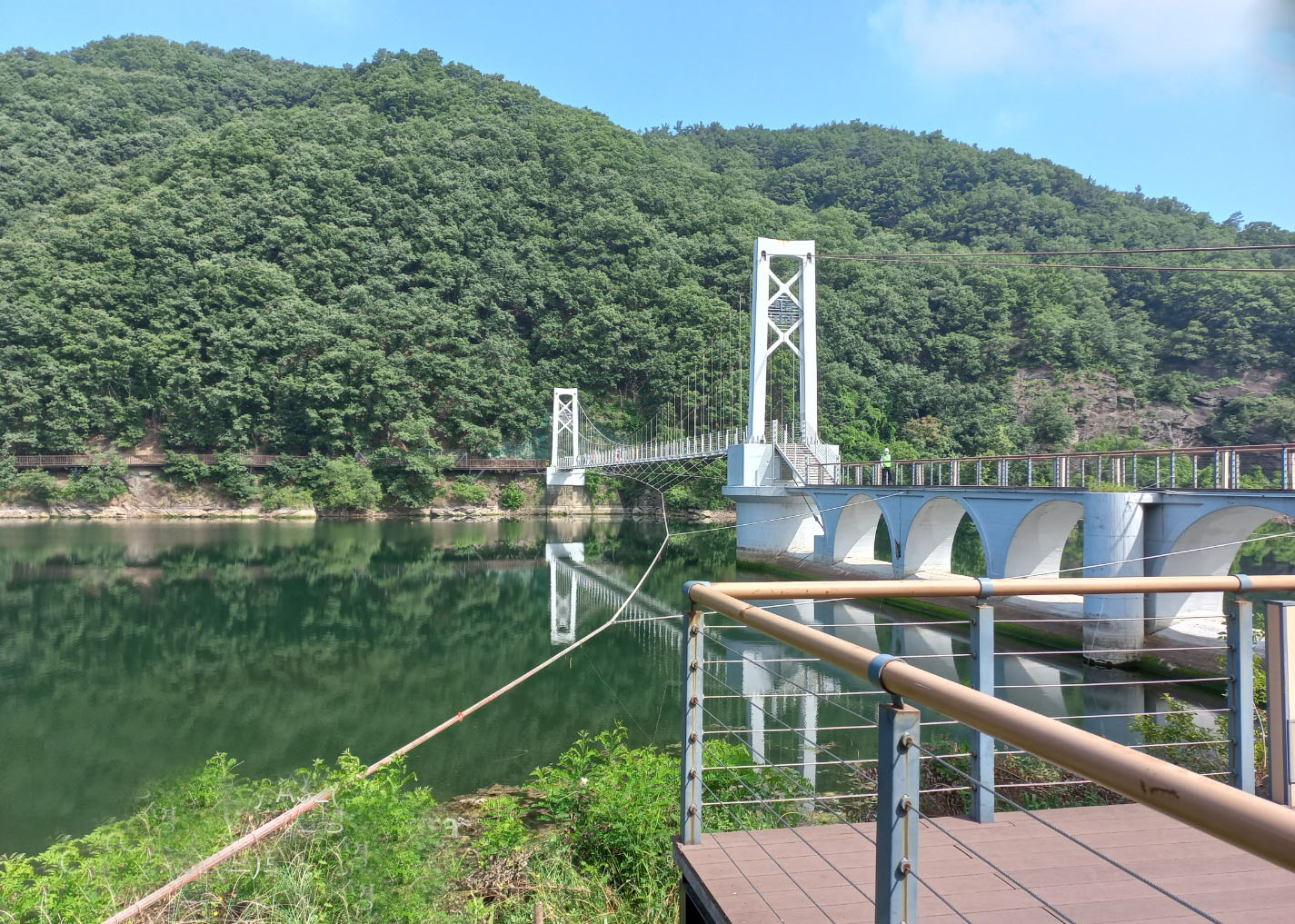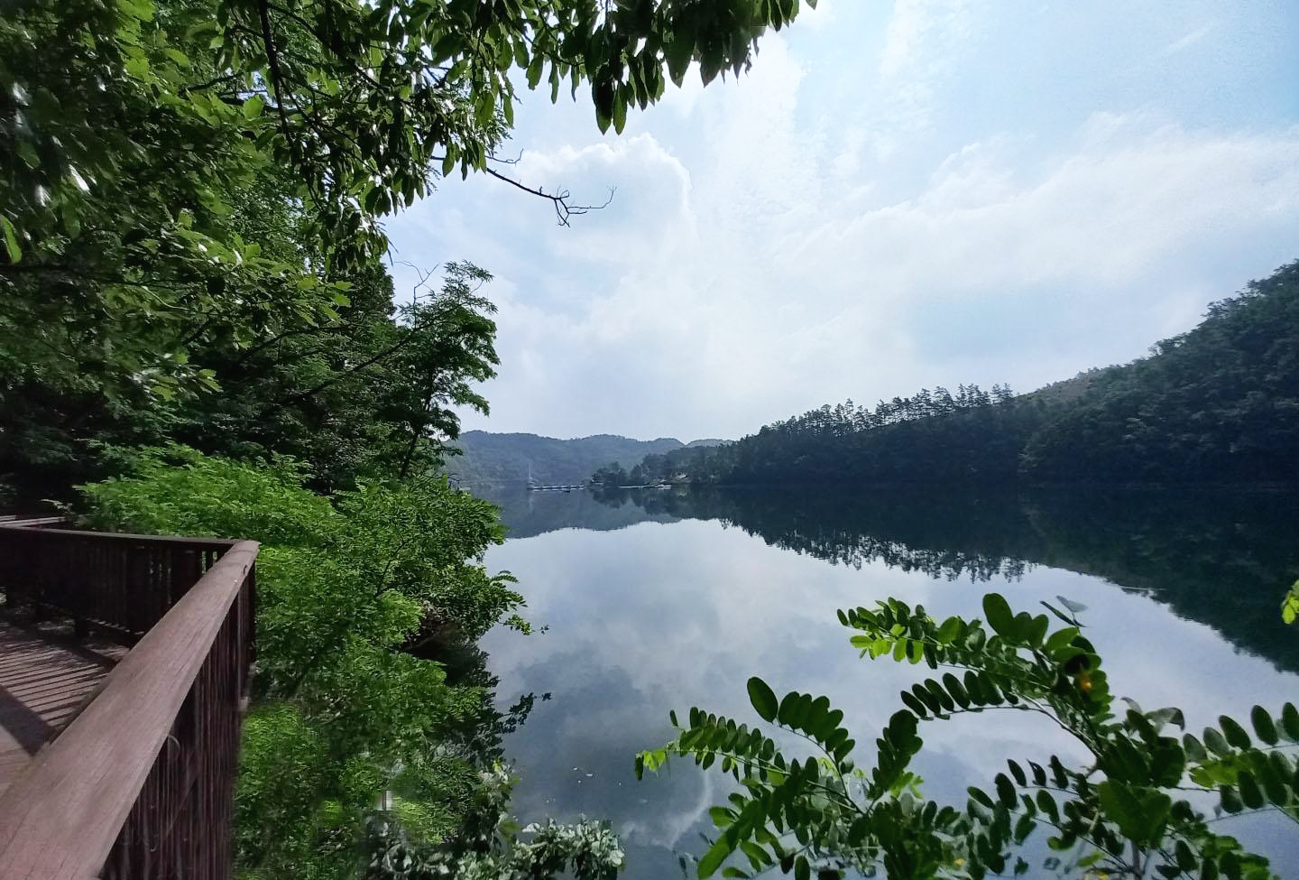 데크길을 따라가다 보면 초평저수지를 감상할 수가 있어요. 초평저수지는 충청북도에서 가장 큰 저수지이자 충주호와 함께 가장 유명한 낚시터라고 합니다.