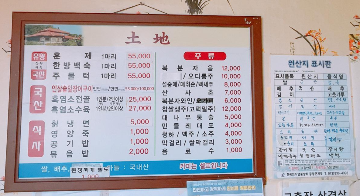 메뉴는 훈제, 한방백숙, 흑염소에 장어구이까지 있어요. 이 메뉴판에는 안나와 있지만 훈제와 주물럭은 반마리 주문도 가능하답니다. 신랑과 저도 훈제 반마리(28,000원)를 주문했어요~