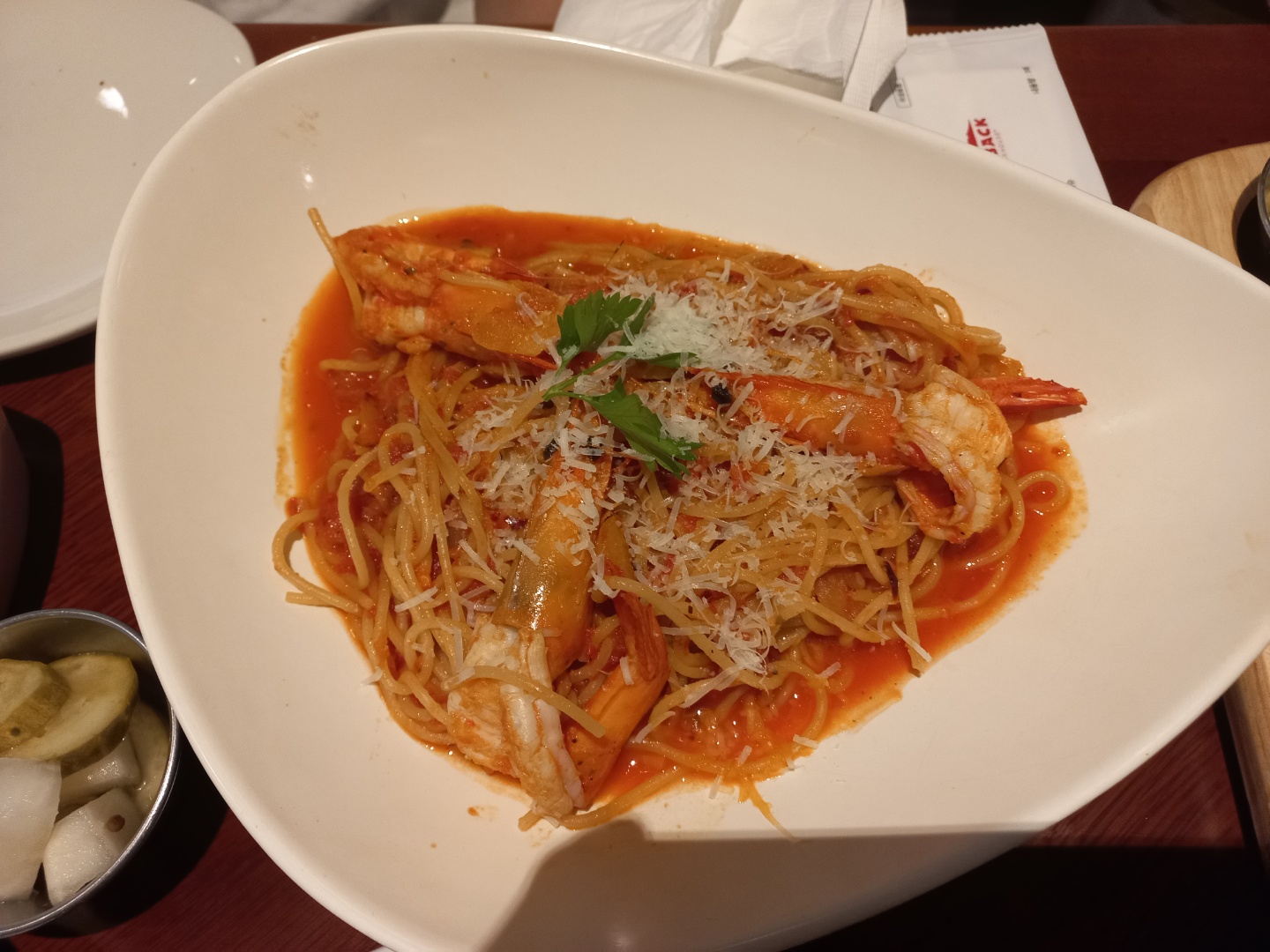 슈림프 아라비아따(24,900원)는 신선한 새우와 매콤한 맛에 파스타예요~ 파스타 치고는 가격이 매우 사악하네요~ㅠ