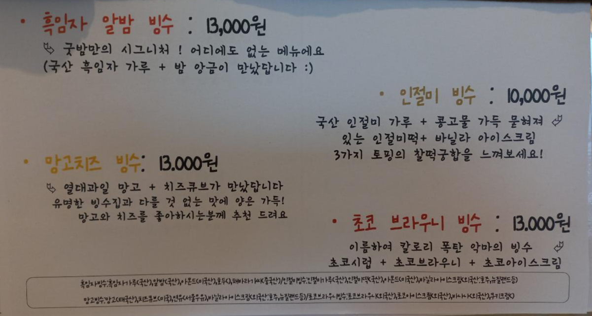맛있을 것 같은 빙수들도 있어요~ 다음에 가게 된다면 빙수를 먹어봐야겠어요~