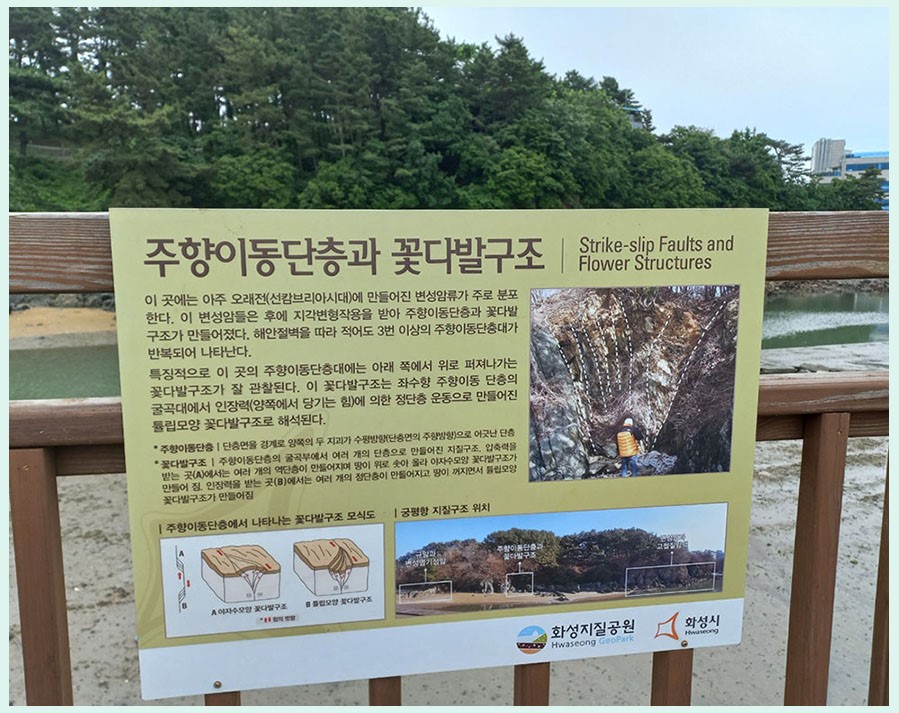 이 변성암들은 후에 지각 변형 작용을 받아 주향 이동단층과 꽃다발 구조가 만들어졌다고 하네요~