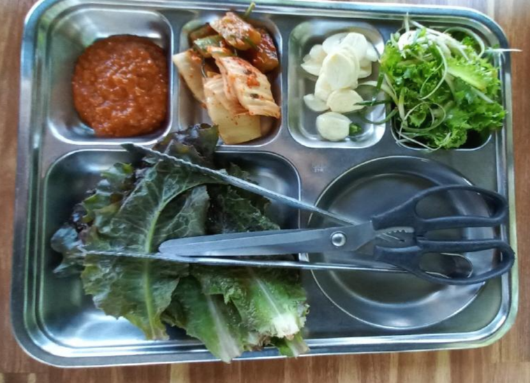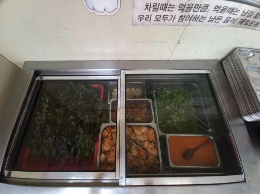 셀프코너에는 상추, 마늘, 오이김치, 배추김치, 쌈장, 채소무침이 있어요~