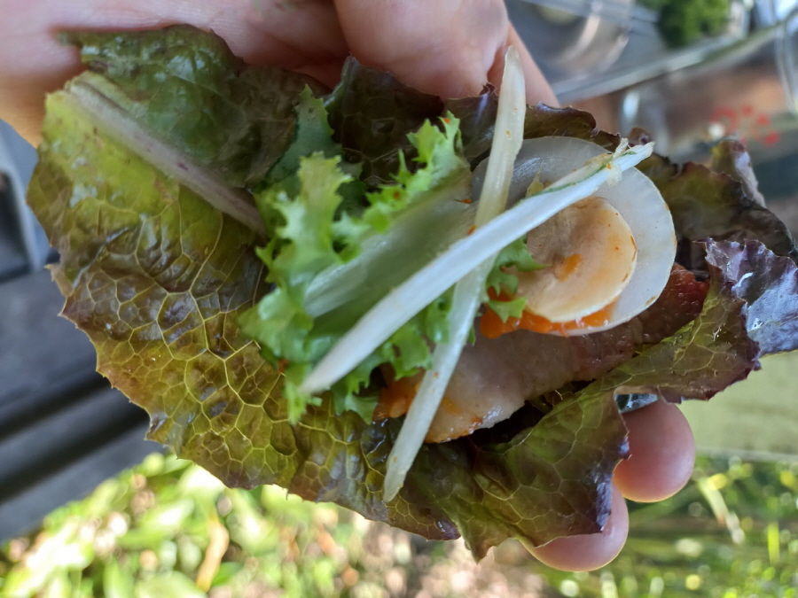 상추에 고기와 구운 마늘과 양파 그리고 쌈장, 채소무침을 함께 쌈 싸서 먹으니 너무 맛있어요~