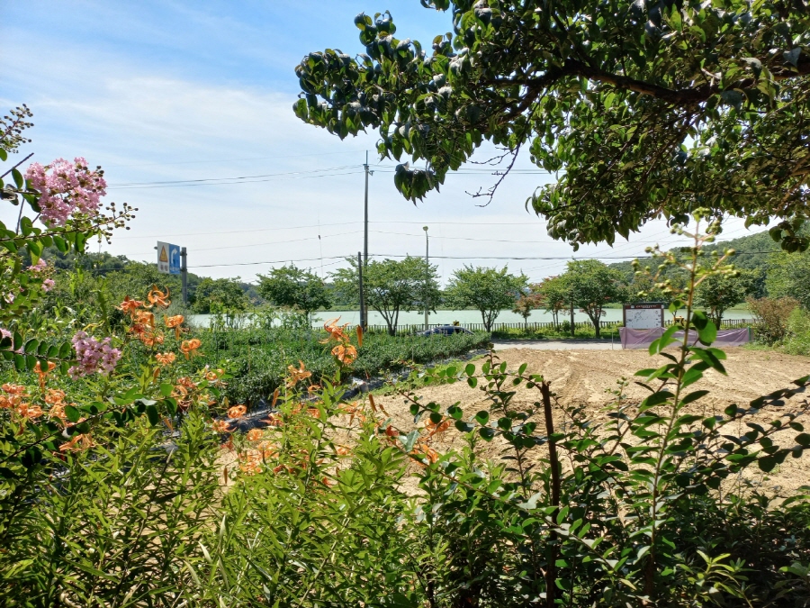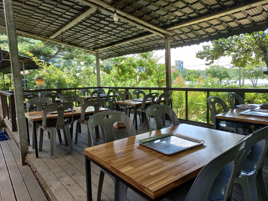 특히 앞에 예쁜 꽃들도 보이고 갈치저수지까지 보면서 야외에서 먹으니 고기 맛이 더욱더 맛있어요~