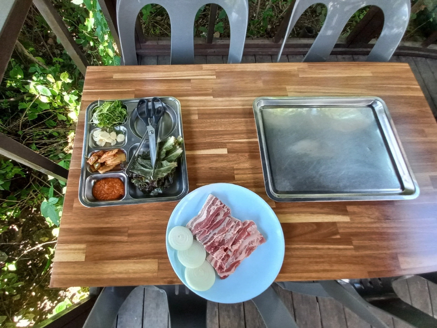 고기와 반찬들을 가지고 와서 자리를 잡았어요~ 저희가 주문한 삼겹살은 450g 정도 되는 것 같아요. 금액은 17,000원을 지불했어요~