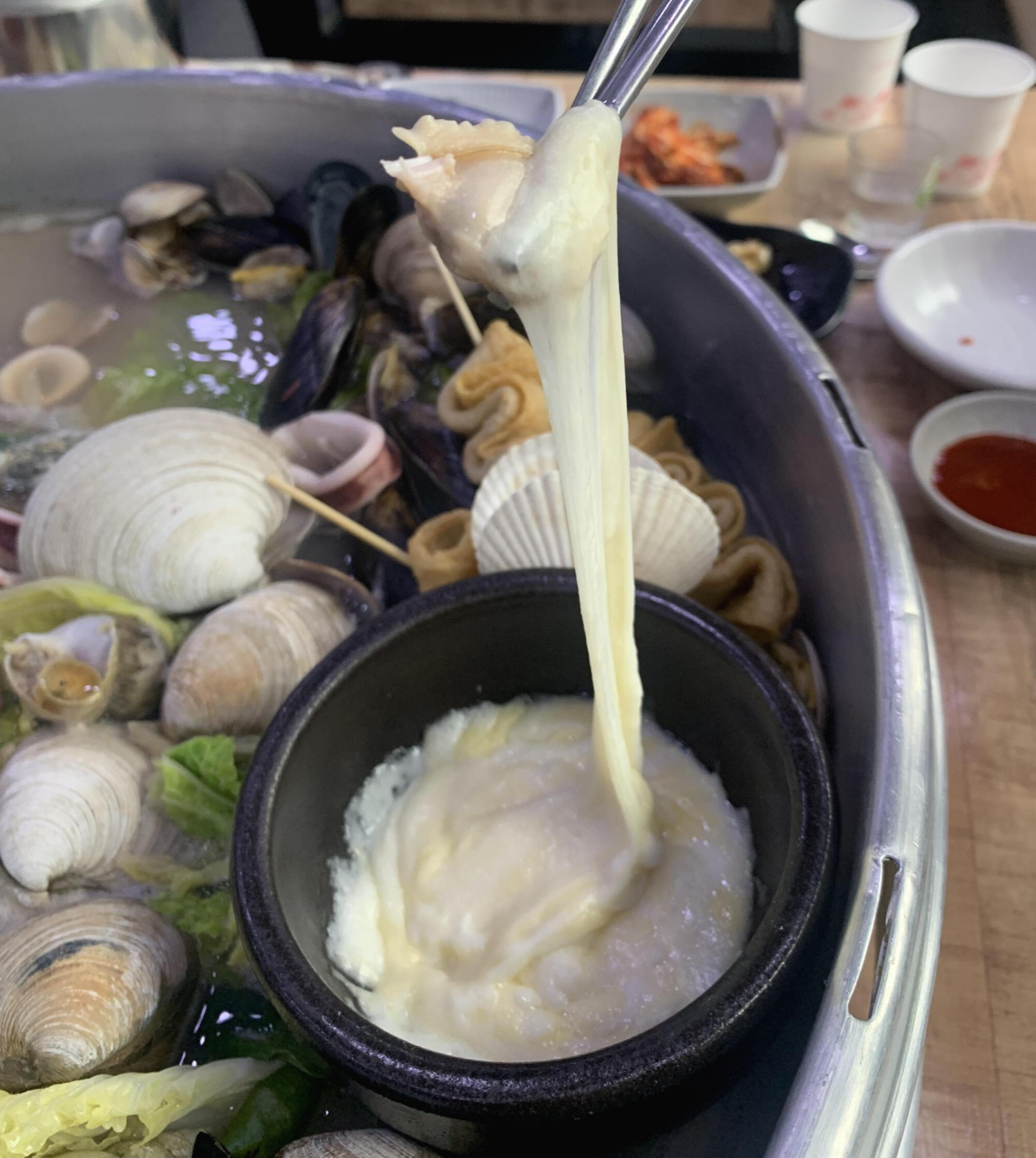 조개를 치즈에도 찍어먹어 봤어요. 치즈가 쭈~욱 늘어지네요~ 근데 저는 조개에 치즈는 좀 안 맞더라고요~