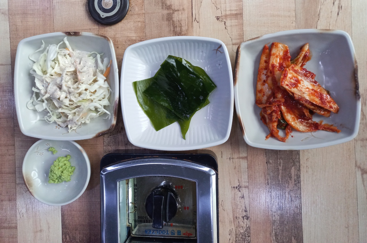 밑반찬으로는 샐러드, 다시마, 배추김치가 나와요~