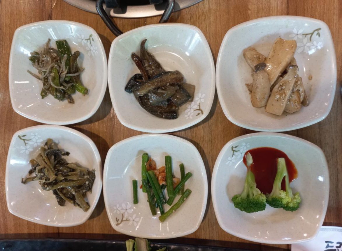 밑반찬은 멸치볶음, 가지나물, 송이버섯볶음, 시래기나물, 마늘종 볶음, 브로콜리가 나오고