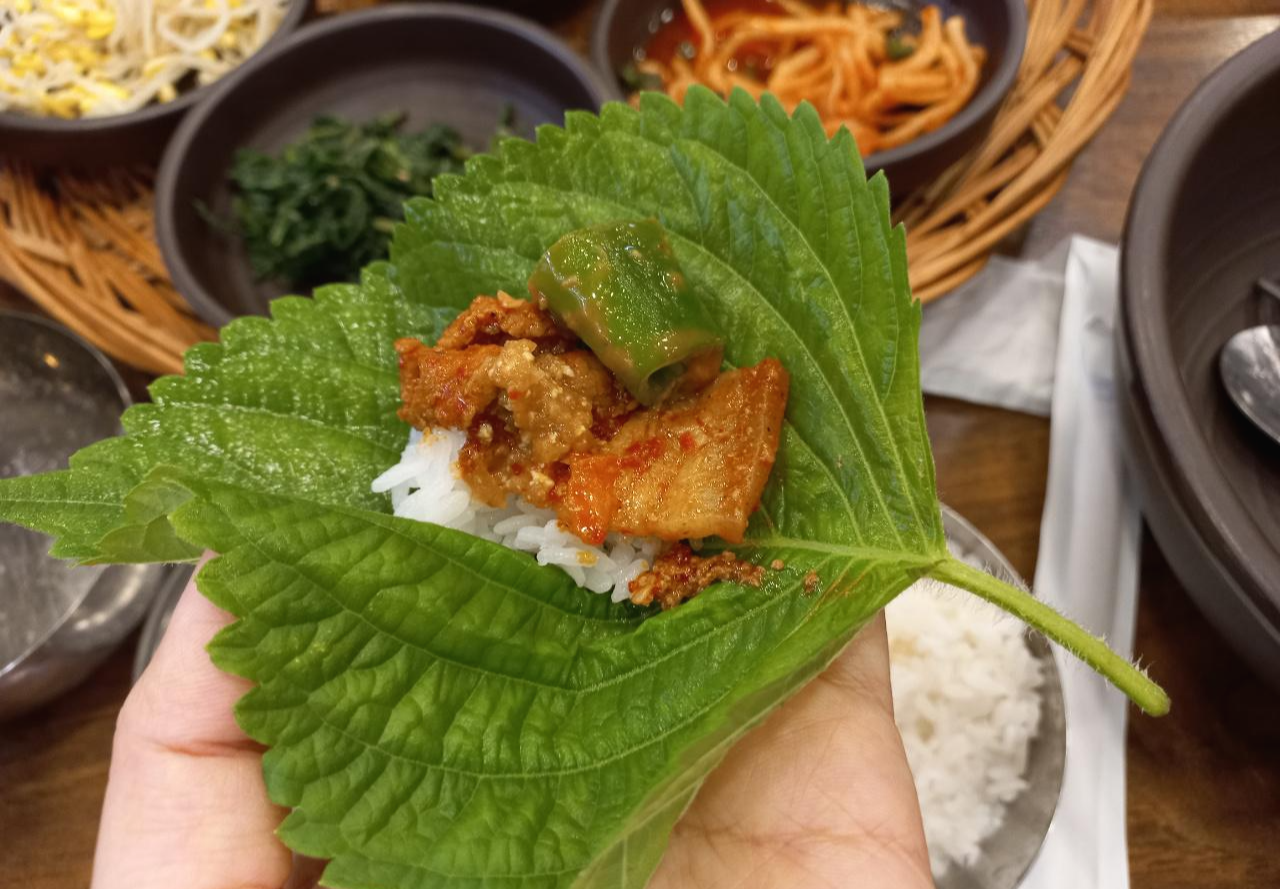 깻잎에 고기와 고추, 제육볶음 그리고 쌈장을 싸서 먹어도 맛있고
