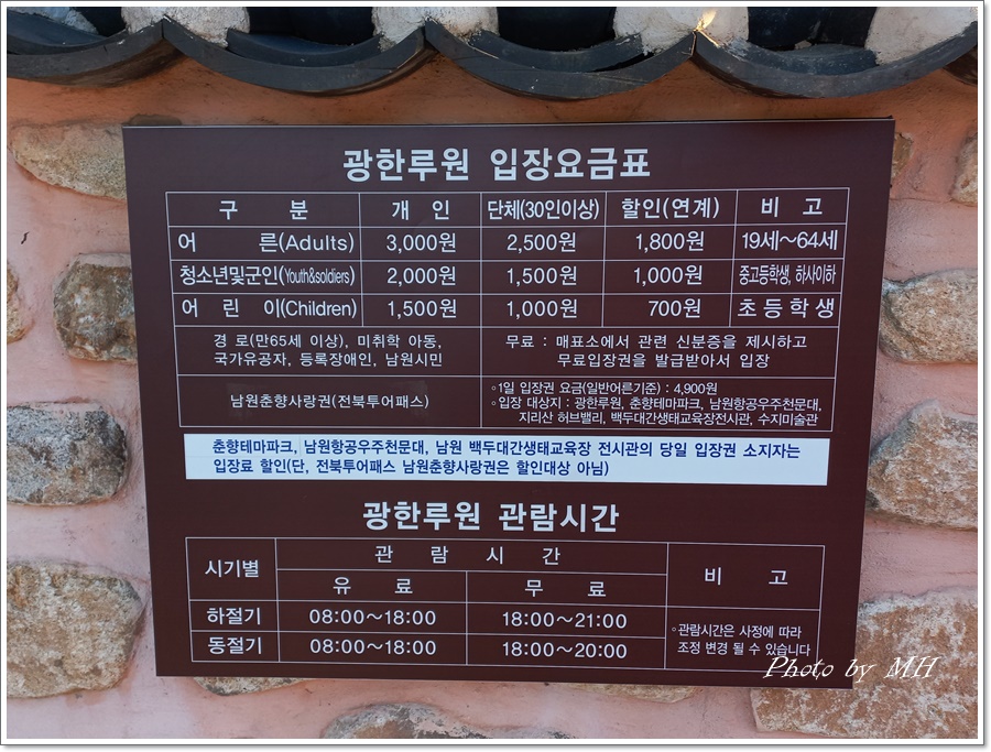 광한루원에 입장요금은 어른 3,000원이에요. 하지만 18시부터는 무료랍니다~👍🏻 그래서 18시 이후에 입장을 했어요~ 무료도 좋지만 무엇보다 광한루원의 야경을 구경하고 싶었으니까요~