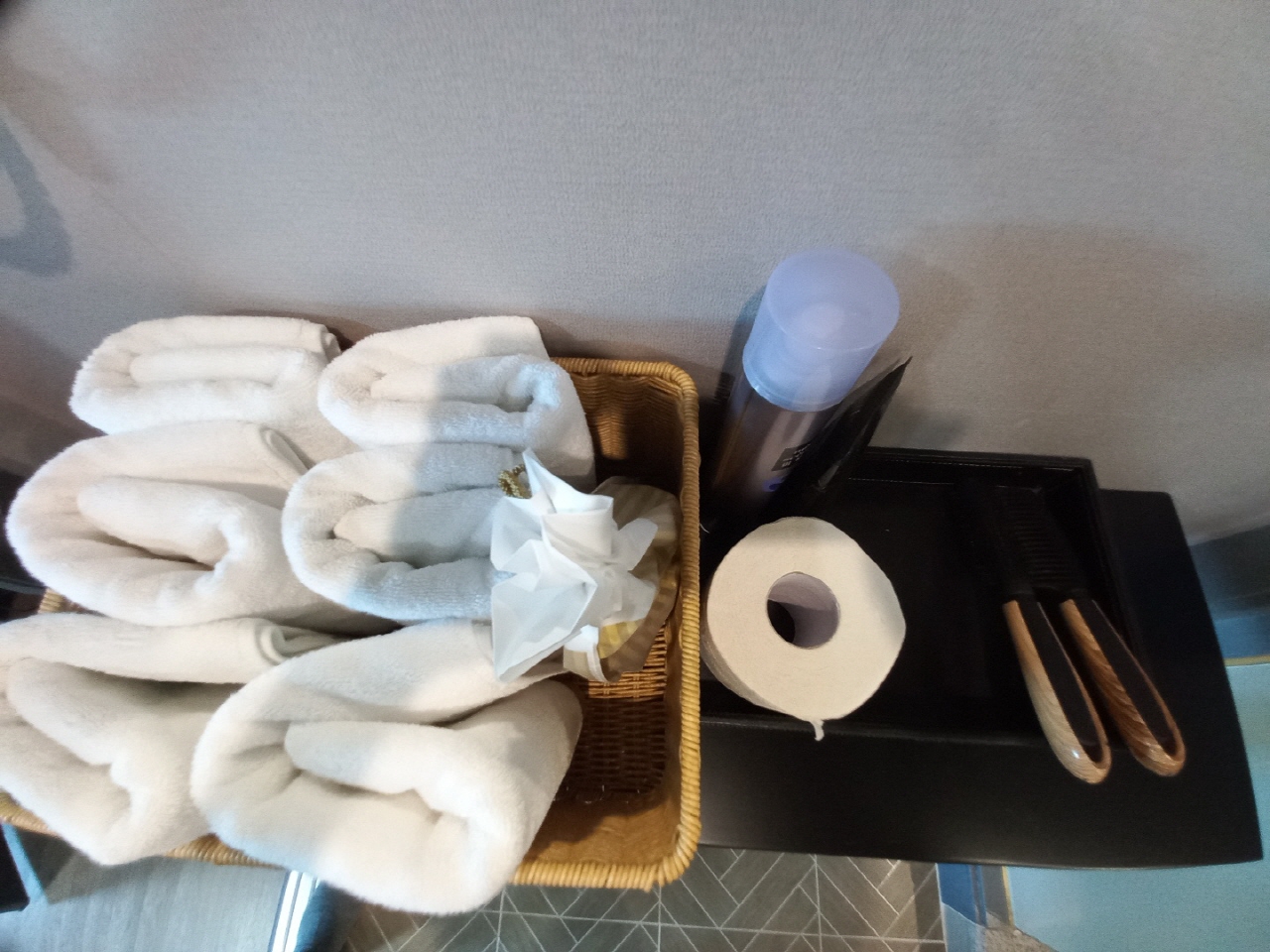 타월도 넉넉히 있고 일회용품과 빗도 비치되어 있답니다~ 드라이기와 옷걸이도 있고요~