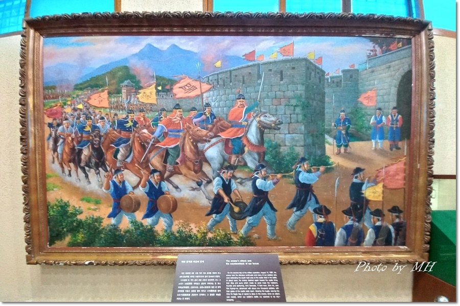 아군의 병사 행차 위용 : 전라병사 이복남은 장사 50 여기를 포함한 수백 명의 병력만을 거느리고 적이 이미 성밑을 포위하고 있는 가운데를 위용을 갖추고 마상에 앉아 만복사 앞 대로를 거쳐 남문으로 당당하게 들어가고 있는 모습이랍니다.