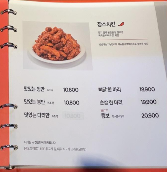 장스 치킨이 맛있는 윙만(10,800원)부터 콤보(20,900원)까지 그리고 치즈닝 쫀도그(5,500원), 어묵탕(13,900원)등 다양한 사이드 메뉴도 있어요~ 종류가 참 다양하네요~