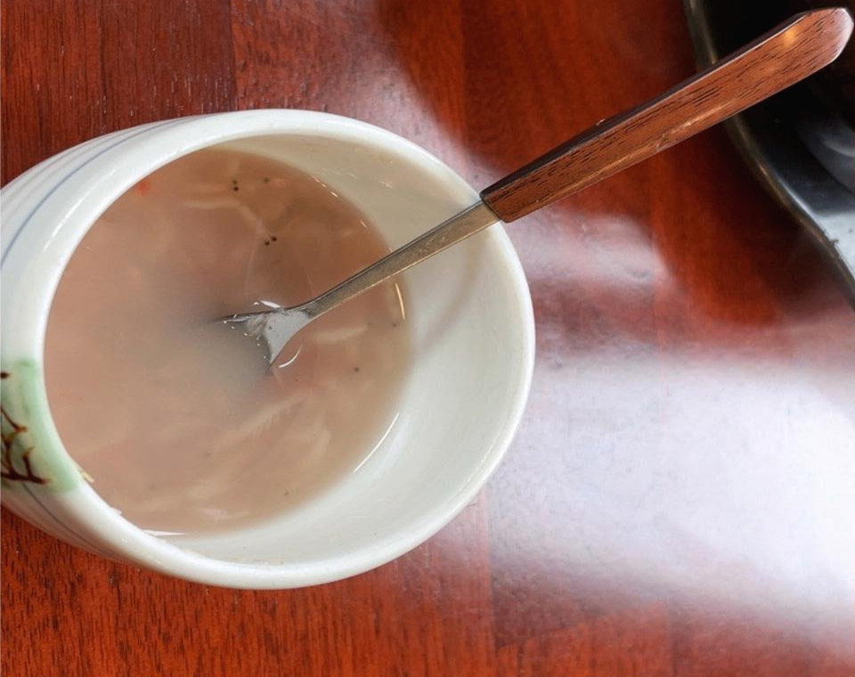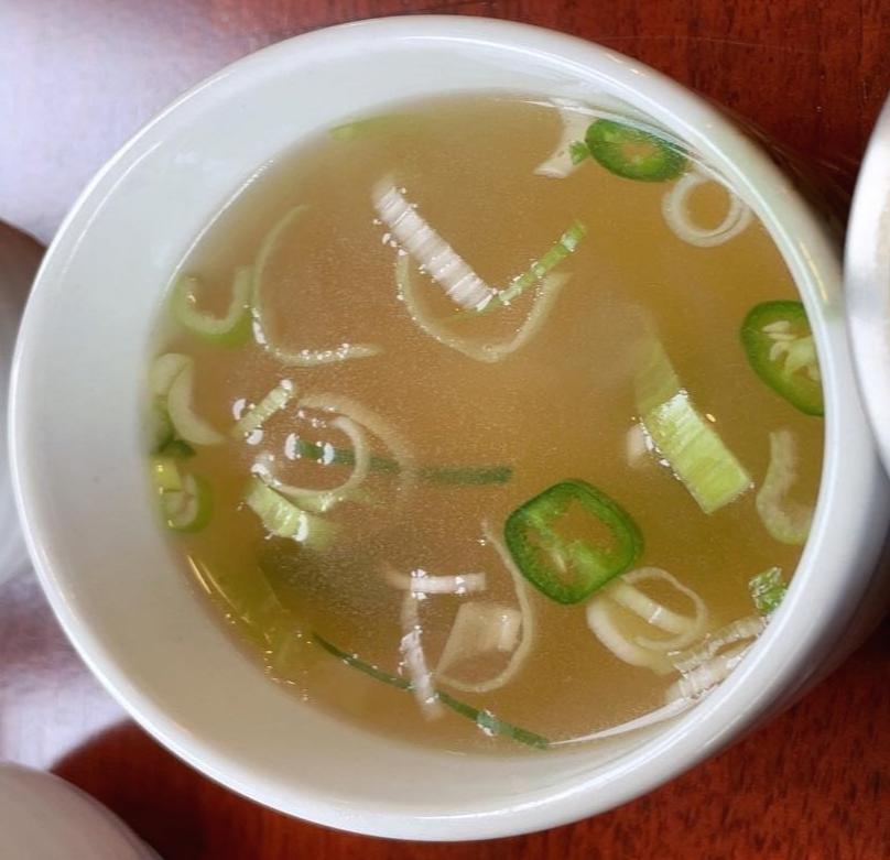 비빔밥을 먹다가 퍽퍽하다 싶을때 고추와 파가 들어간 육수 맛이 나는 국물도 한 번씩 떠서 먹었어요~