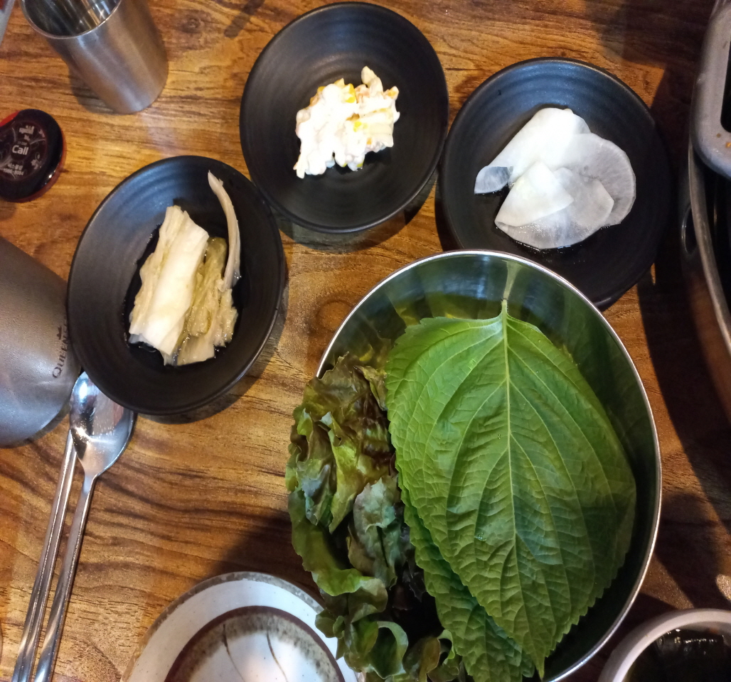 상추와 깻잎, 배추김치와 쌈무, 쌈장, 마늘과 고추도 있고 미역냉국도 있어요~