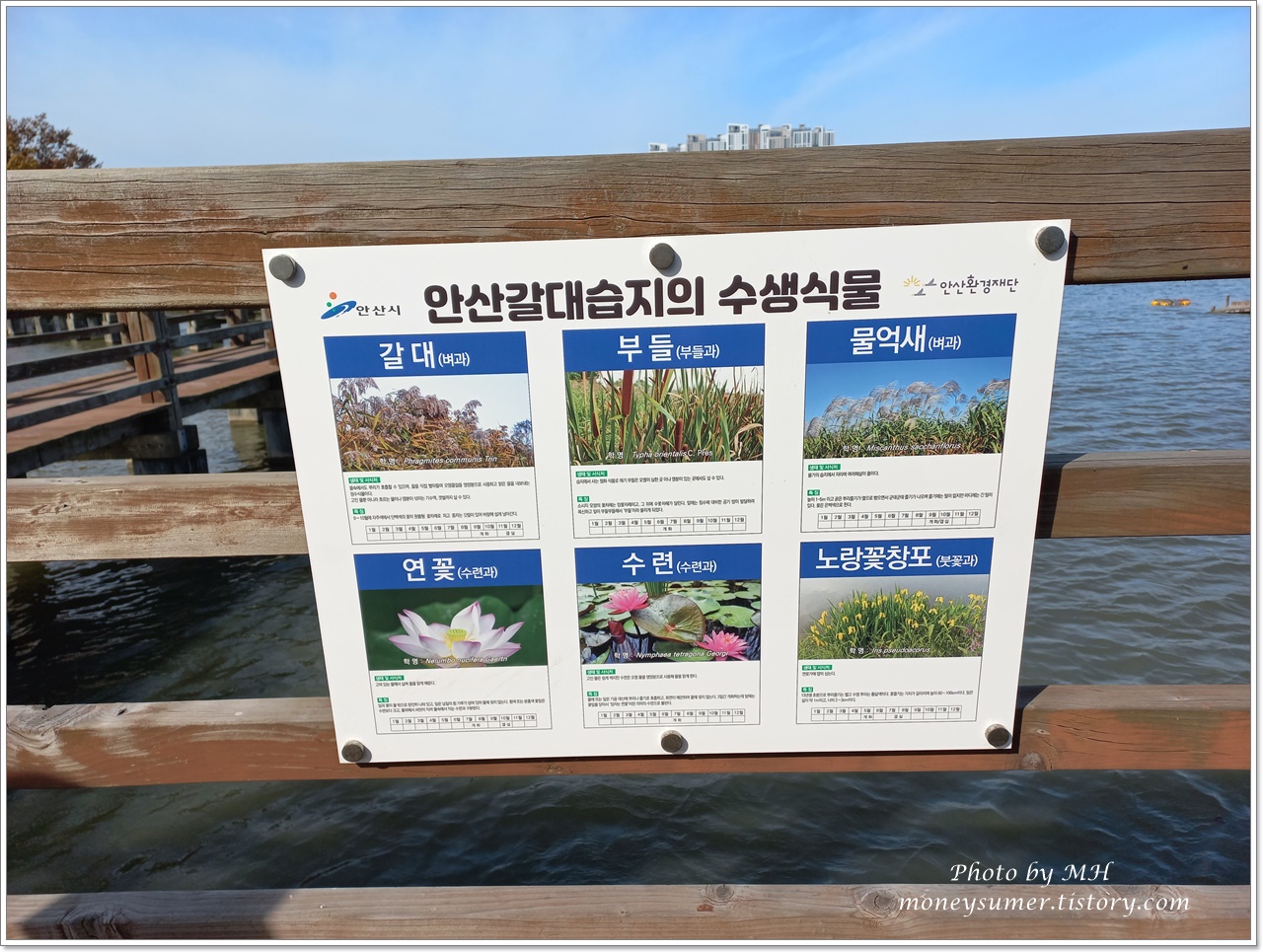 안산 갈대습지의 수생식물인 갈대, 부들, 물억새, 연꽃, 수련, 노랑꽃창포에 대한 설명도 안내되어 있어요~
