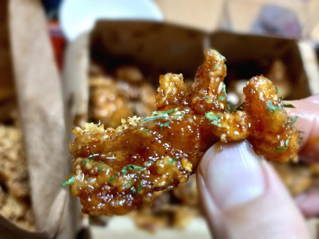 이건 순살 3종 세트 중 깐풍 치킨이에요~ 진한 양념에 바삭함이 더해져 매콤 달콤한 맛이에요~