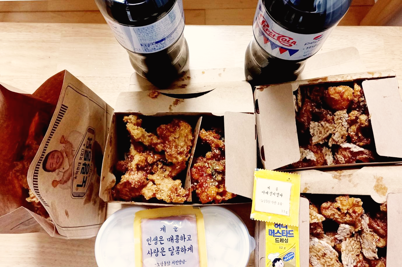 주문한 치킨 두 마리와 양념소스, 허니 머스터드, 소금, 치킨무를 집에 와서 펼쳐봤어요~ 양이 정말 많더라고요~ 물론 이 많은 양을 아들과 저만 먹은 게 아니고 신랑과 딸도 함께 먹었답니다~😄
