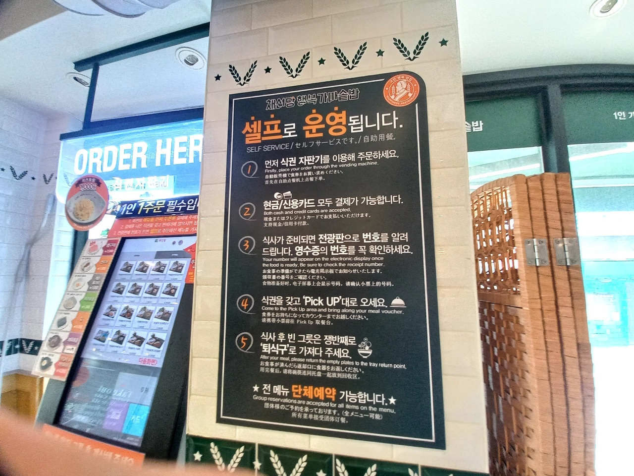 키오스크에서 메뉴 주문 후 현금 또는 신용카드로 결제 후 영수증 번호와 전광판 번호가 일치하면 식권을 갖고 Pick Up대로 음식을 가지러 가면 된답니다~