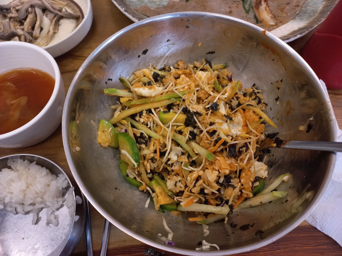 공깃밥을 넣고 골고루 섞어줬어요~ 밥을 다 안 넣은 이유는 함께 나온 국과 함께 먹기 위해 조금 남겨뒀어요~