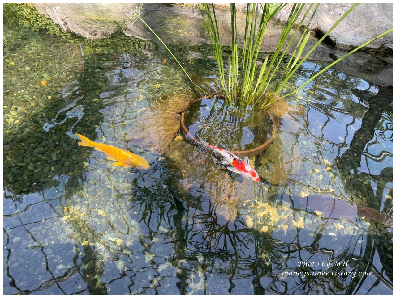 연못에 알록달록 예쁜 물고기도 보이고