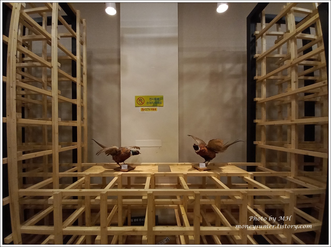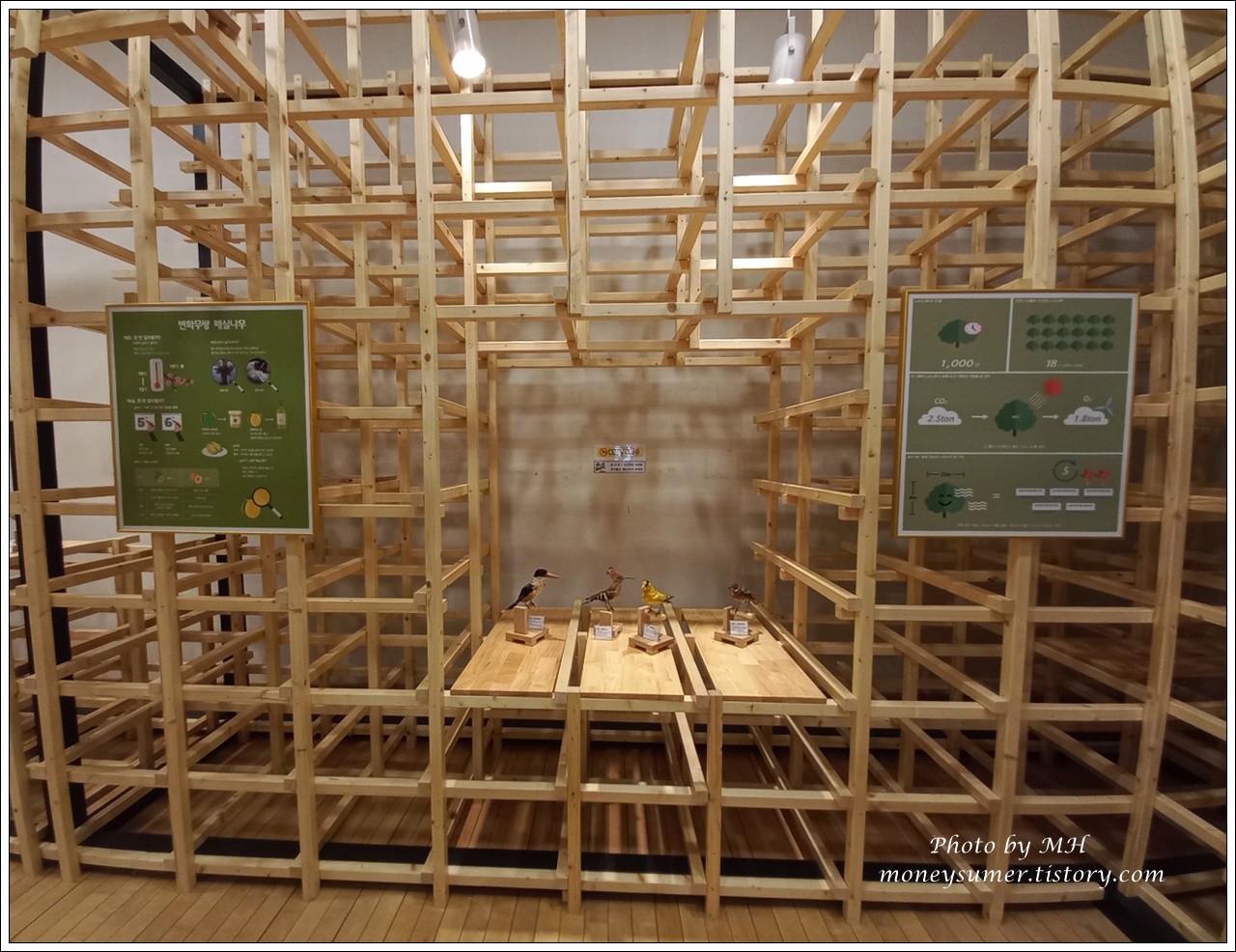 나무의 관한 설명과 새 모형들이 전시되어 있어요~