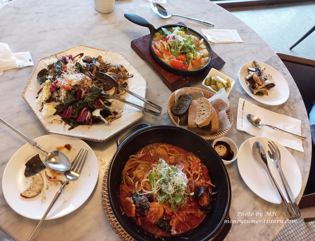 식전 빵을 다 먹은 후 샐러드가 나와서 먹고 있다가 다른 음식도 세팅된 후 한 번에 찍어봤어요~