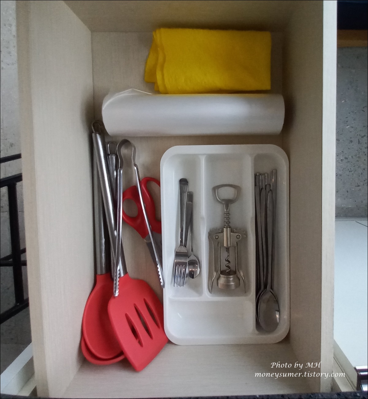 와인따개, 각종 조리도구, 수저, 포크, 티스푼, 행주 그리고 비닐팩까지 비치되어 있어요~