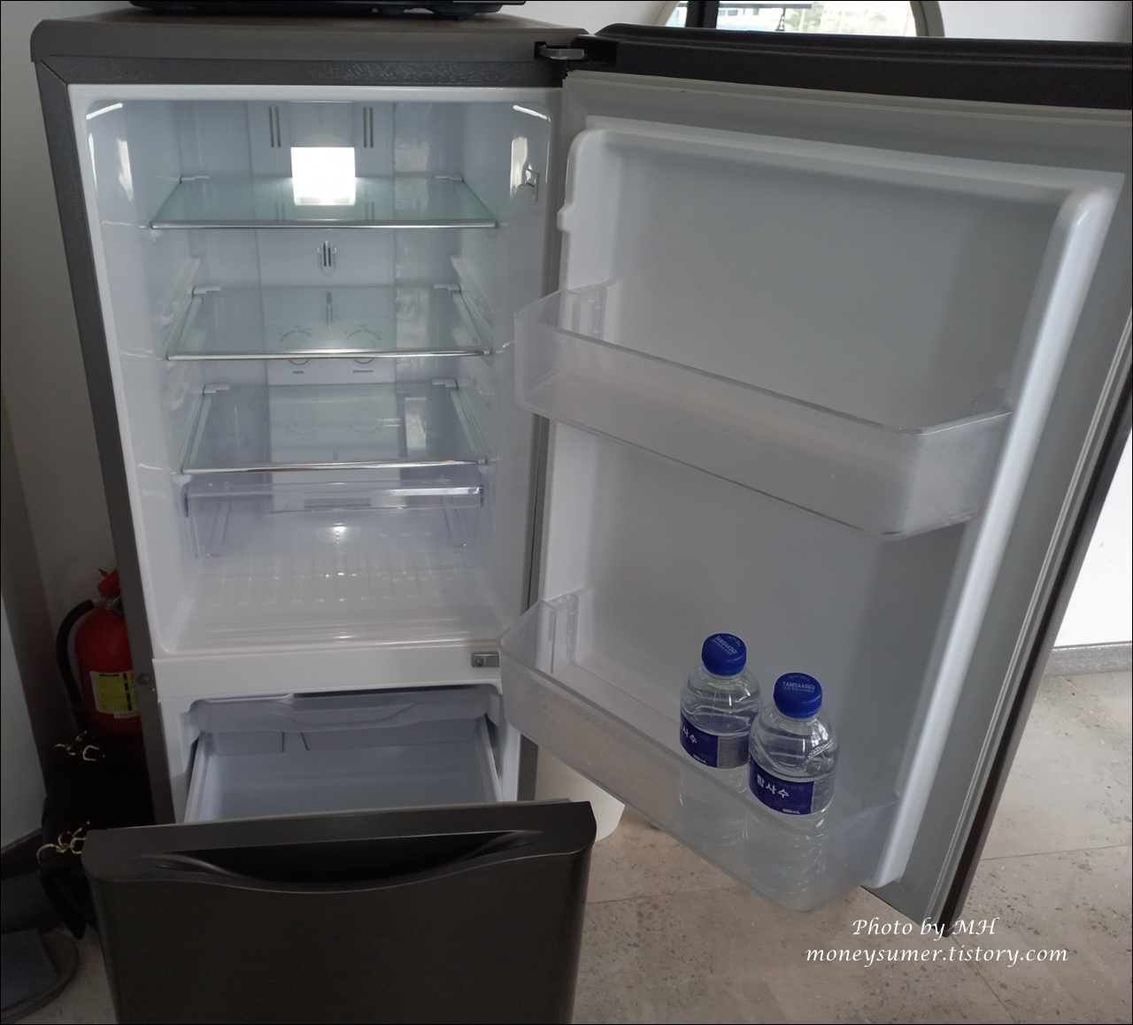 냉장고 안은 깔끔하고 생수 2병이 들어있더라고요~