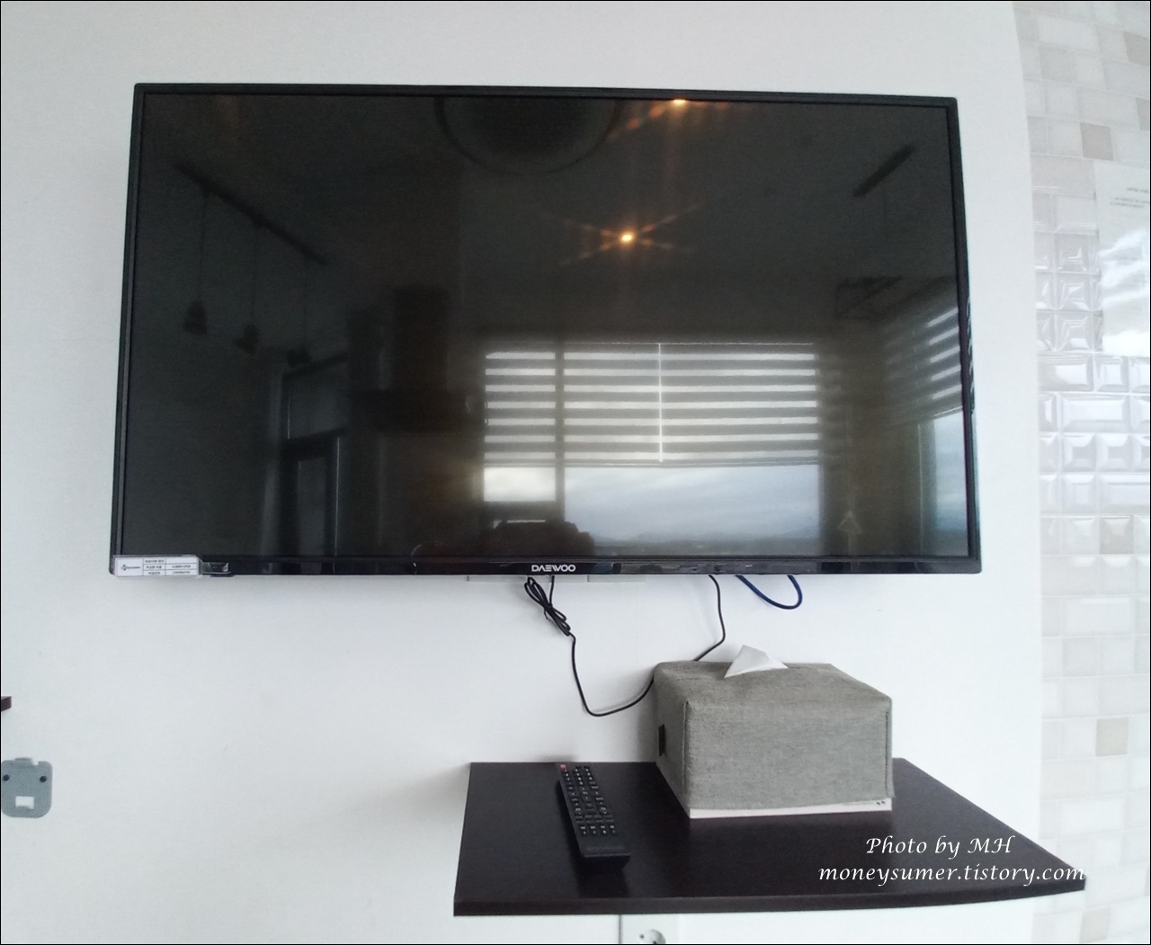 TV 밑에 작은 선반에는 사각티슈도 마련되어 있고