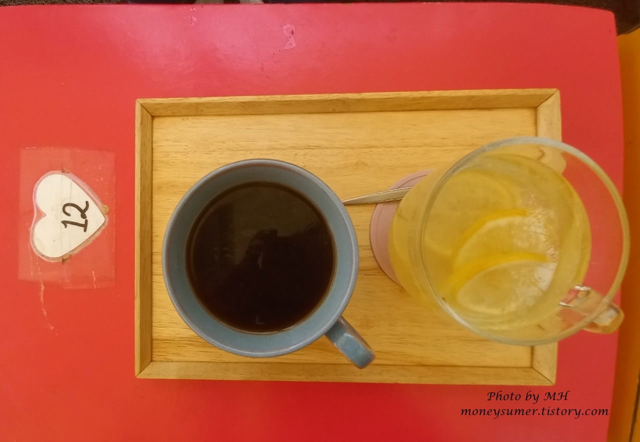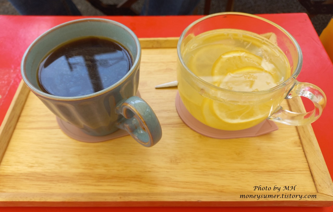 진동벨이 울려서 가져온 아메리카노(5,000원)와 레몬차(6,500원)예요~