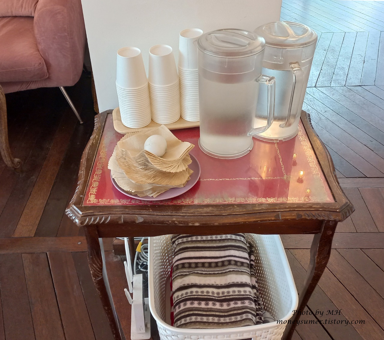 물과 종이컵, 티슈 그리고 무릎담요도 비치되어 있어서 편리하네요.