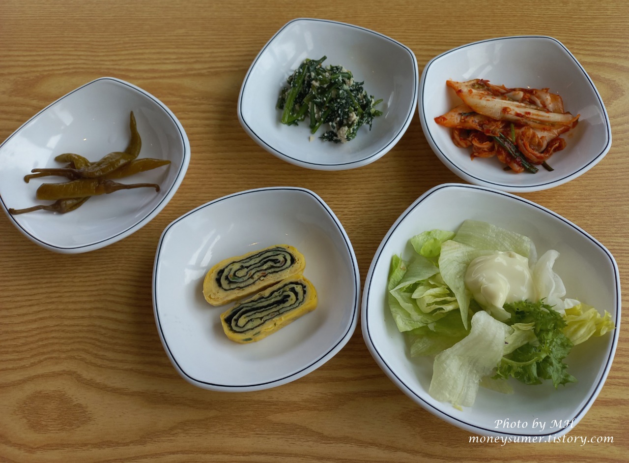 밑반찬으로는 초절임 고추, 달걀말이, 나물, 배추김치, 샐러드가 나오네요~