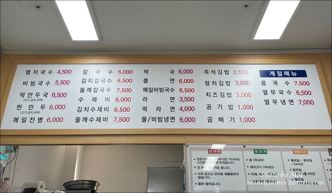 메뉴는 국수류, 수제비류, 김밥류, 라면, 냉면 등 주로 면 종류가 많고 가격이 참 착해서 좋네요~