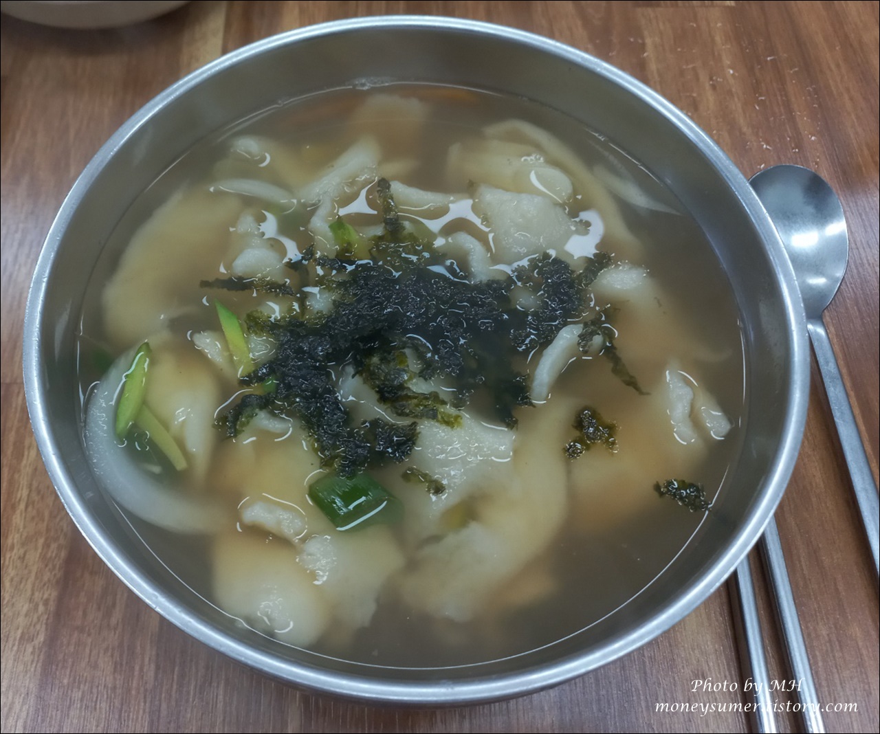 제가 주문한 수제비(6;000원)예요~ 호박, 양파, 파, 김이 들어가 있는 수제비는 특별한 맛은 아닌 평범한 수제비이지만 간이 딱 알맞게 되어 있어서 너무 맛있어요~