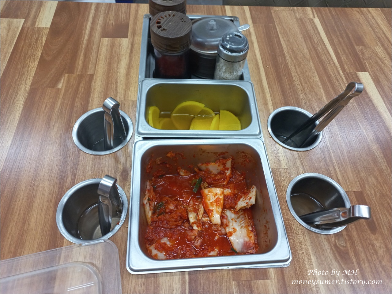 각각의 테이블에는 김치와 단무지, 양념통이 구비되어 있어요~