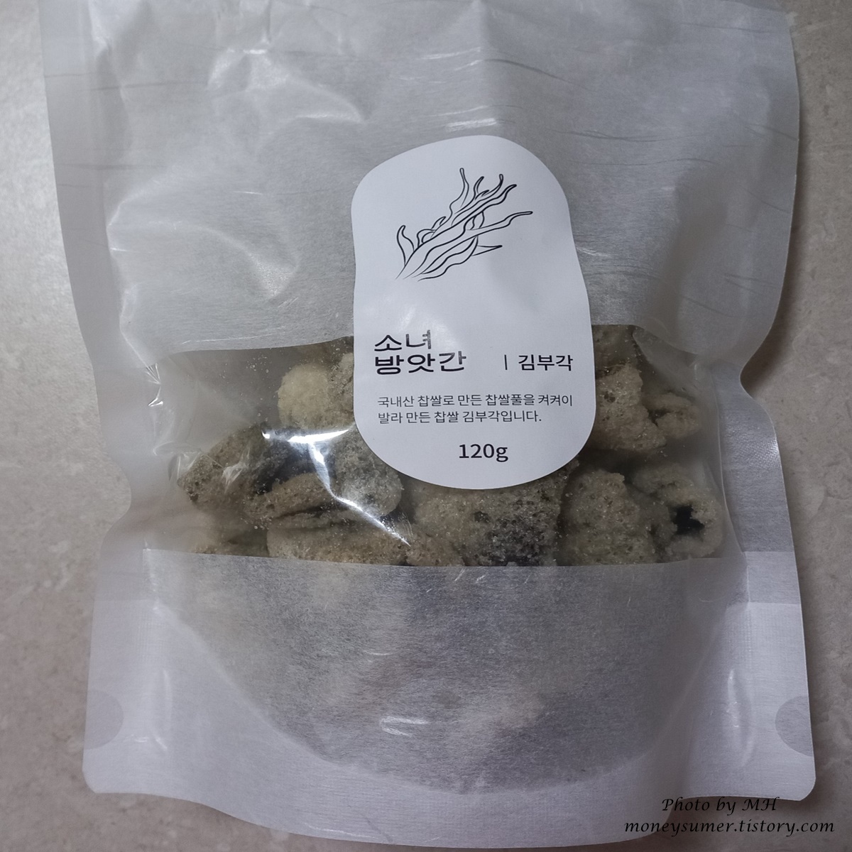 식사할 때 맛있게 먹었던 김부각(120g - 9,800원)을 사 왔어요. 국내산 찹쌀로 만든 김부각은 청과 함께가 아니어도 간식으로 그냥 먹어도 바삭하니 너무 맛있답니다~