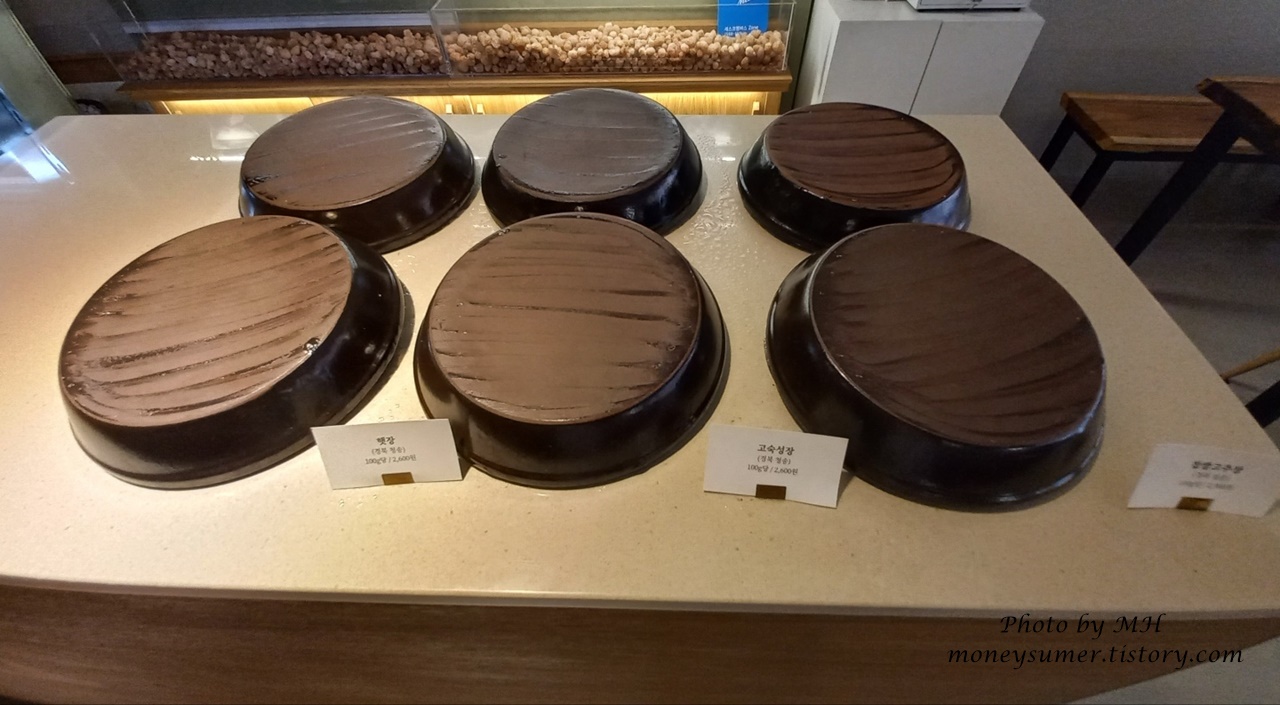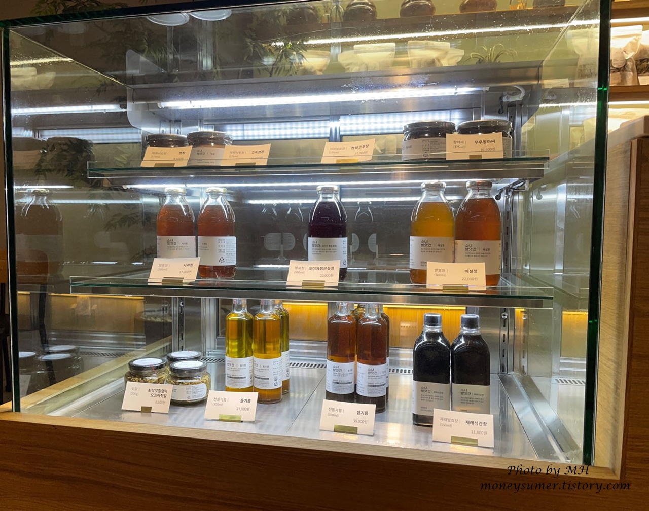 쇼케이스에는 무장아찌, 사과청, 오미자청, 매실청, 들기름, 참기름 재래식 된장도 있어요~ 가게 내부 구경을 하고 있다 보니