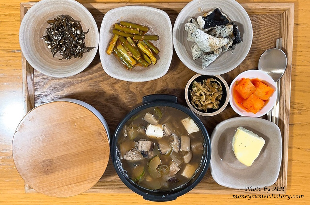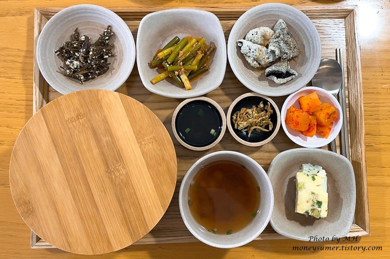 자연에서 채취한 뽕잎, 취나물이 들어간 산나물밥에 밑반찬과 함께 비벼먹으니 건강해지는 기분이 들어요. 하지만 맵고 짠 자극적인 음식 맛에 길들여진 우리의 입맛에는 역시 많이 싱겁다는 생각이 드는 건 어쩔 수 없네요~