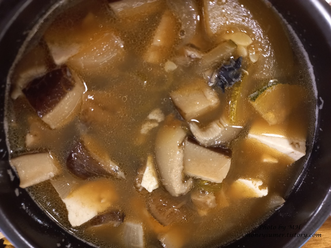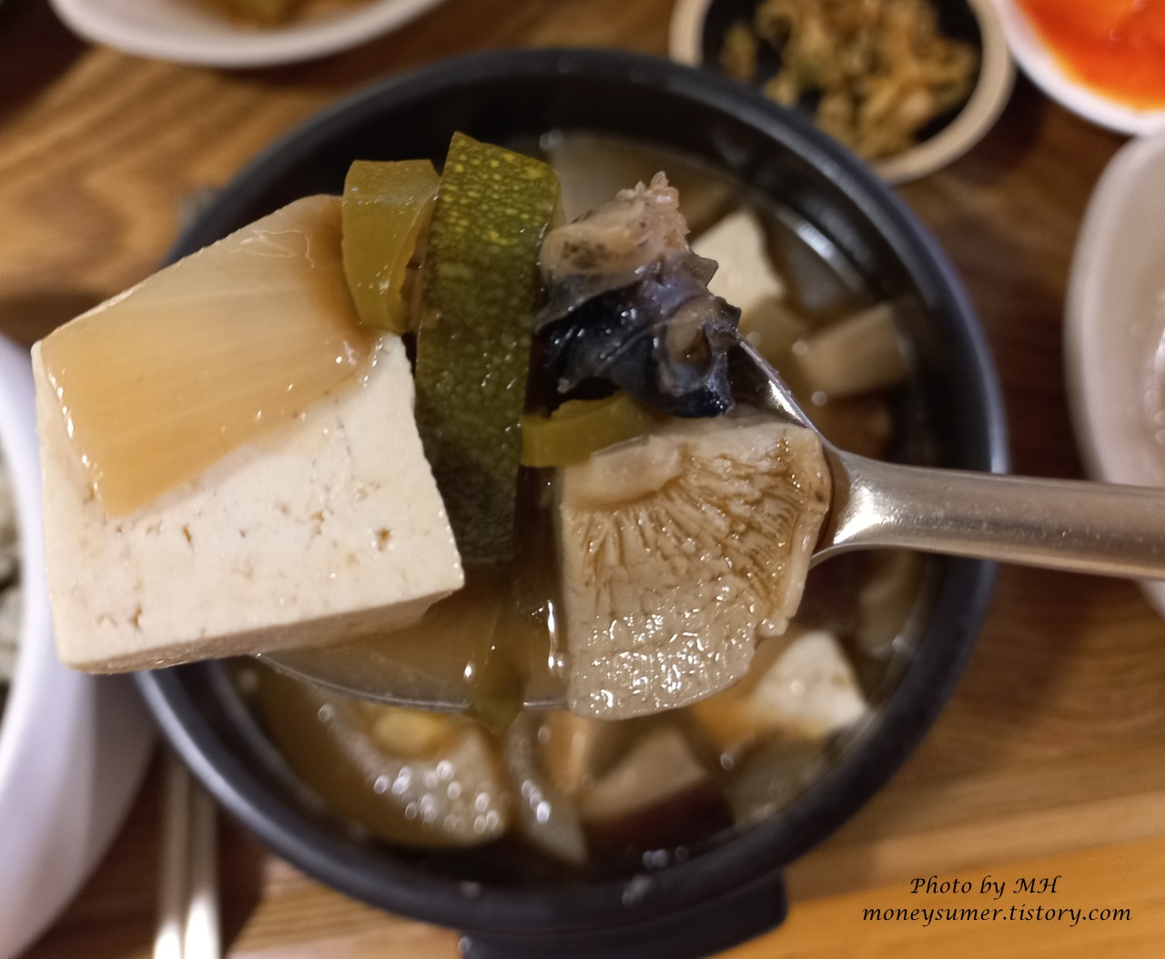 우렁, 호박, 두부, 버섯, 양파 등이 푸짐하게 들어간 우렁된장찌개가 싱겁지만 맛있어요~