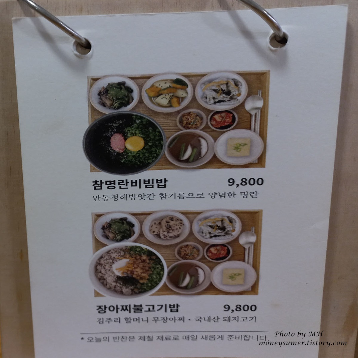 밥 메뉴로는 산나물밥, 소녀 방앗간 꽃핀 수육, 참 명란 비빔밥, 장아찌 불고기밥, 고춧가루 제육볶음, 우렁된장찌개가 있고