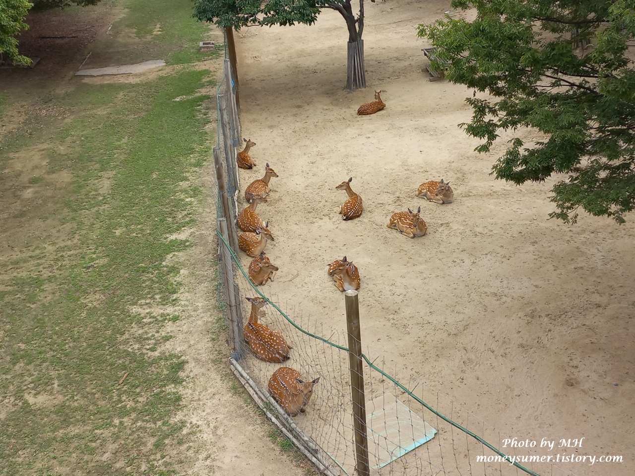 생각보다 꽤 넓은 곳에 많은 수의 사슴이 있어요. 이곳에서는 한 번에 안 잡힌 사슴들의 모습을 보행가교 위에서 찍은 사진이에요~