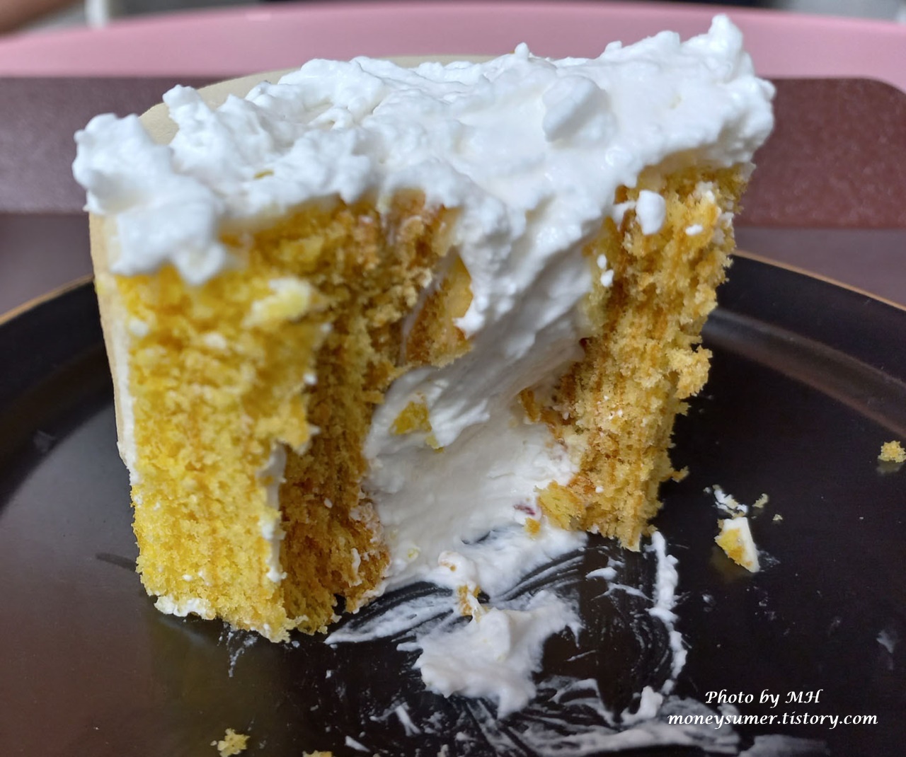 부드럽고 달콤하면서 레몬의 상큼한 맛도 살짝 느껴지는 맛이라 맛있긴 한데 크림이 너무 많이 들어가서 그런지 조금 느끼하긴 했어요~ 다행히 단맛이 전혀 없는 아메리카노와 어울리는 케이크라 남김없이 맛있게 먹긴 했지만요~😄