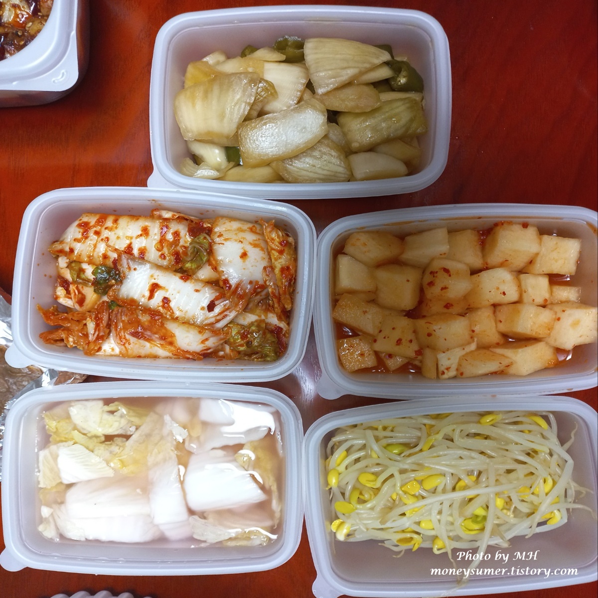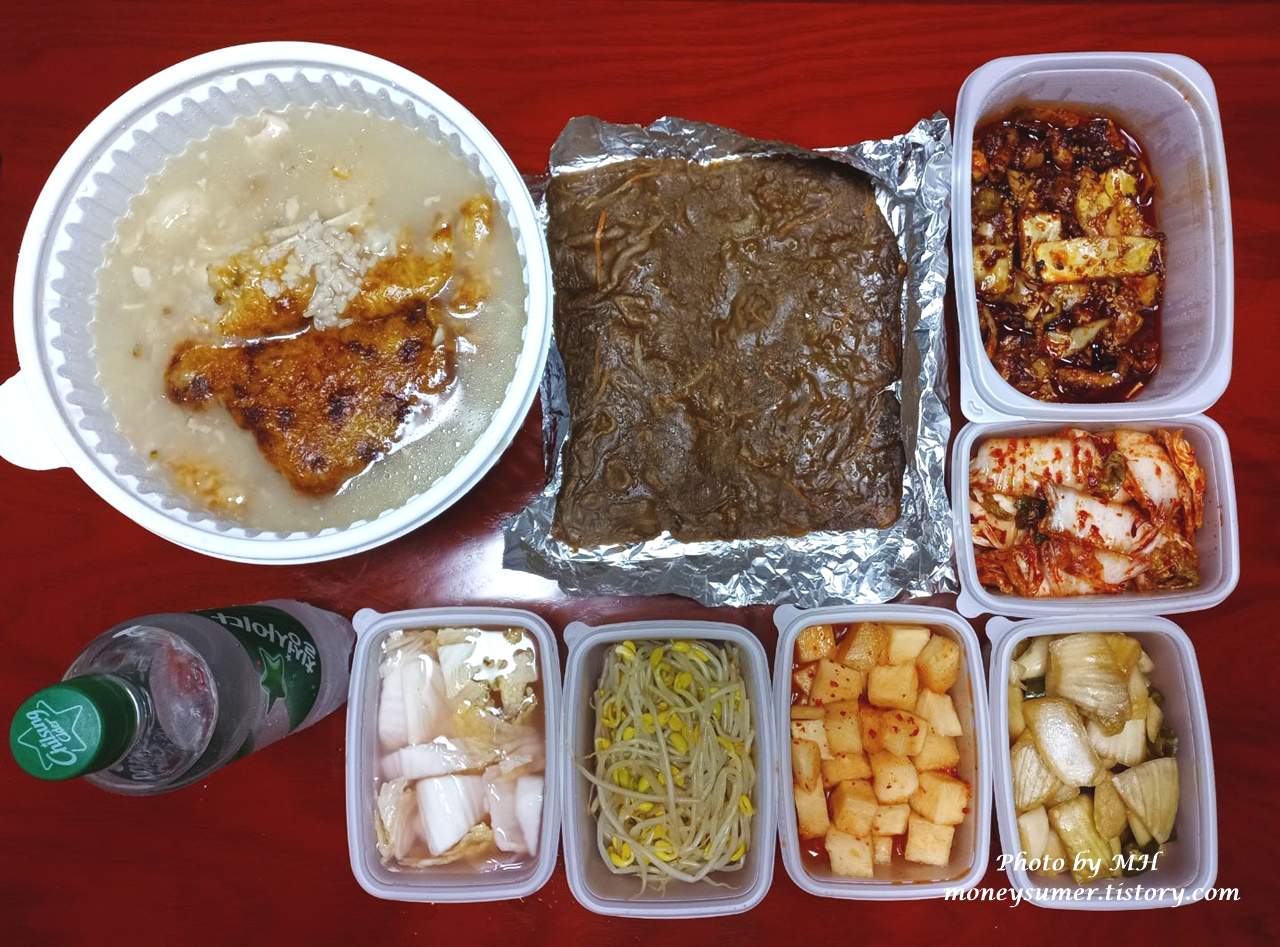 밑반찬은 누룽지백숙에 어울리는 양파절임, 배추김치, 물김치, 깍두기와 쭈꾸미에 어울리는 콩나물이에요~