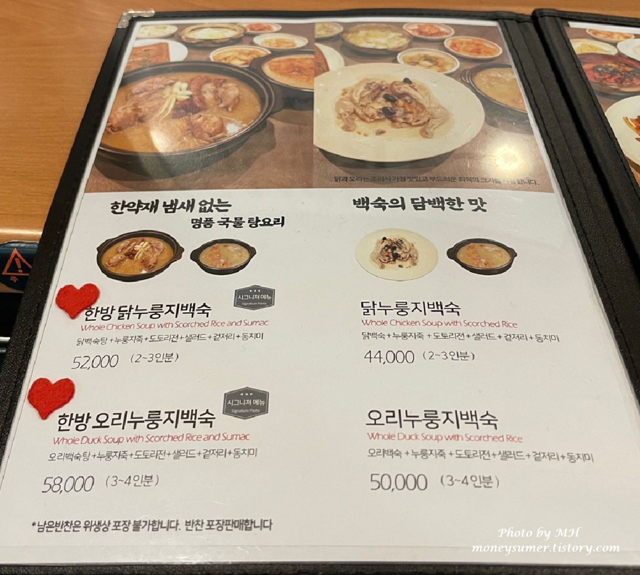 메인 메뉴인 누룽지백숙(44,000원)이에요~ 노릇노릇한 누룽지가 고소하고 쫄깃하니 정말 맛있어요~