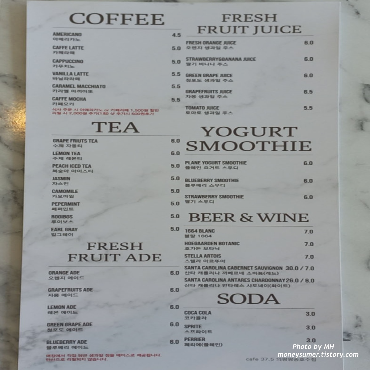 - 커피류: 아메리카노 4,500원 ~ 카페모카 5,500원