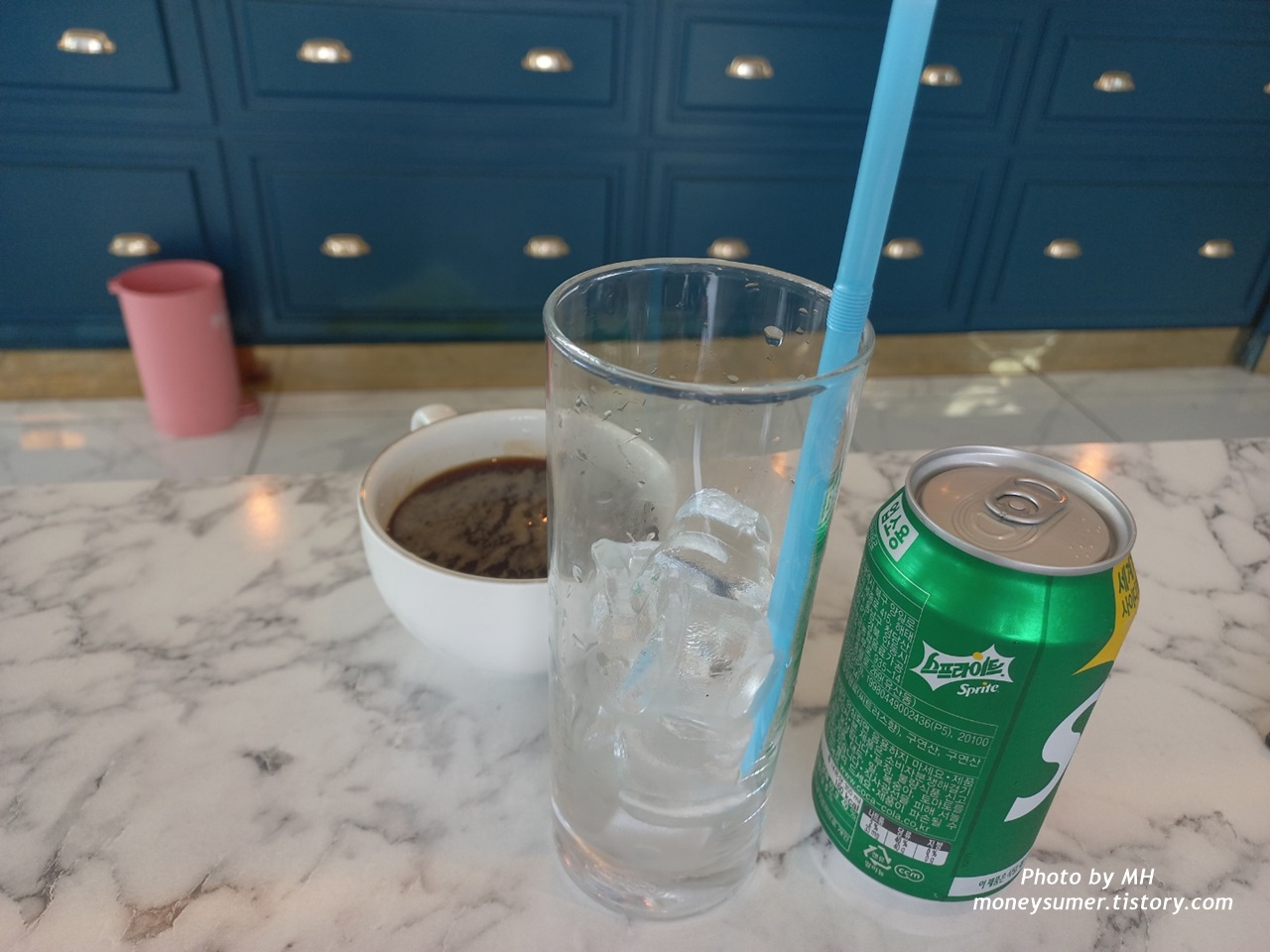 아메리카노(4,500원: 식사메뉴 주문 할인받아서 3,000원)와 스프라이트(3,000원)예요~