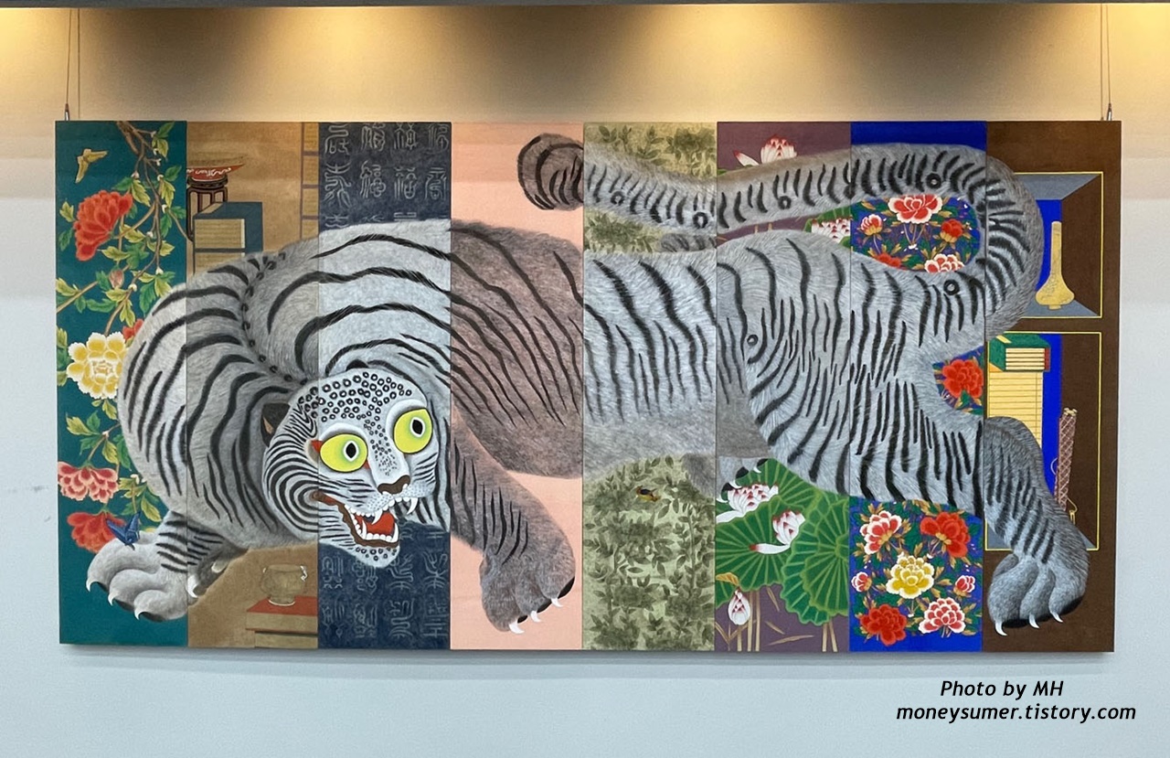 2021년 여주박물관 전통문화교육 민화 강좌의 수강생 8명이 온라인 수업을 통해 한 폭씩 나누어 그린 후에 수업 종료 후 한 폭의 그림으로 완성된 임인년 만복호랍니다. 2022년 임인년 호랑이띠의 해를 맞이하여 각 가정에 액운을 막고 길운이 들어와 대운이 열리길 바라는 마음을 담았다고 하네요~