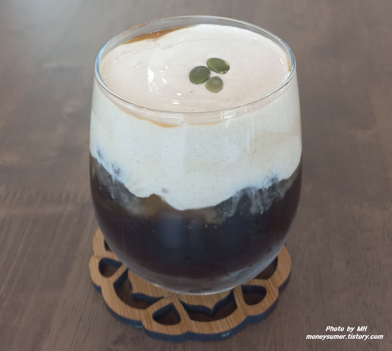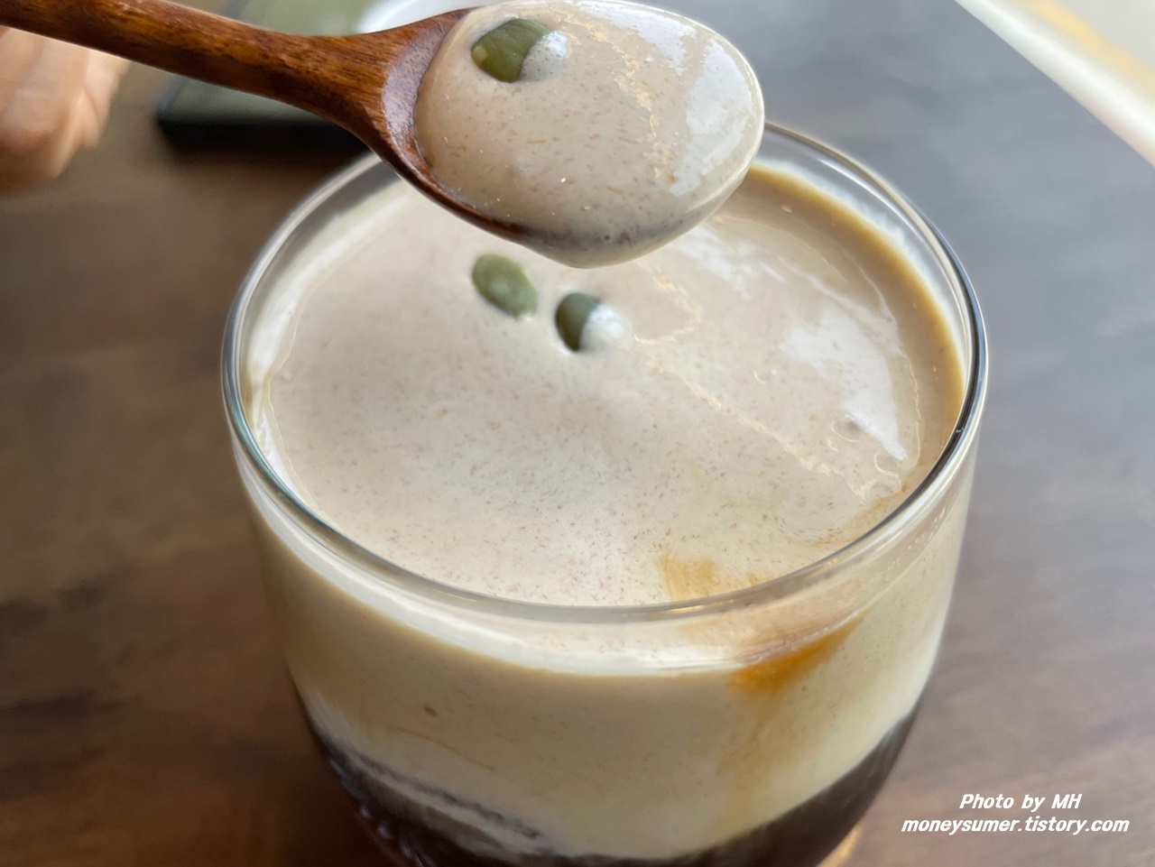 제가 주문한 홍시 가배(7,000원)예요. 아래는 커피 위에는 홍시가 갈려서 나온 것 같아요~