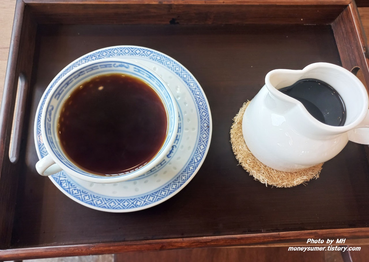 신랑이 주문한 보일링 커피(6,500원)는 커피잔만 나온 게 아니라 따라 마실 수 있게 자기 주전자에 커피를 가득 담아주셨어요~ 보일링 커피는 끓여서 나온 커피라고 직원분께서 설명해 주시더라고요~그래서 그런지 고소하고 깊은 맛이 났어요~